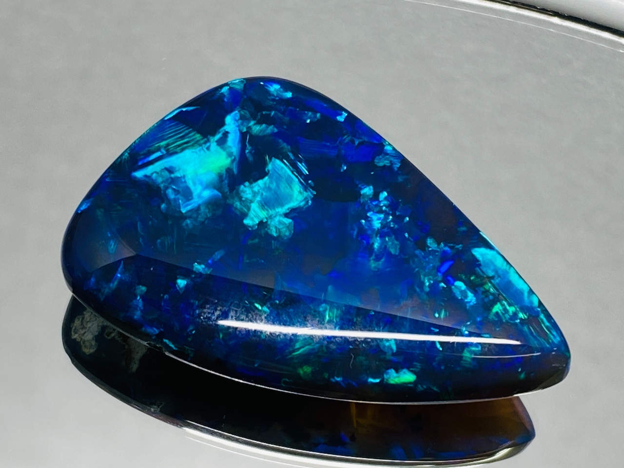 天然のブラックオパールで、深い青色が特徴です。このオパールは希少な石であり、限定1個の商品です。天然の美しい模様や輝きが、輝度や美しさにおいて他のオパールとは一線を画しています。このオパールは、その深い青色が魅力で、まるで星のように光り輝いています。